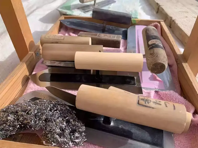 上塗りの漆喰は炊き糊を入れた本漆喰、中塗には自社配合の砂漆喰、下地にはラス網や防水シートを使わず、衣摺に砂漆喰を直接塗り込む衣摺漆喰という工法で施工させていただきました。この先、法多山の新たな観光名所となり沢山の人達がこの場所を訪れた時に、「すごい!」 「かっこいい!」「きれい!」などの言葉を早く聞きたいと思いながら施工させていただきました。